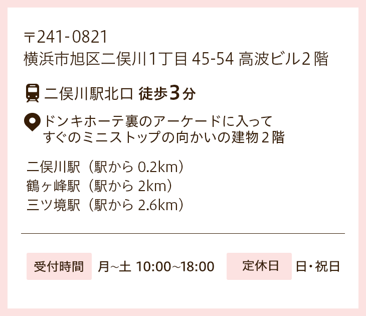 またご本人の考えやストレスや不満などと寄り添って解決していくことが必要です。カウンセリングはある意味では施術よりも大切な時間と考えています。